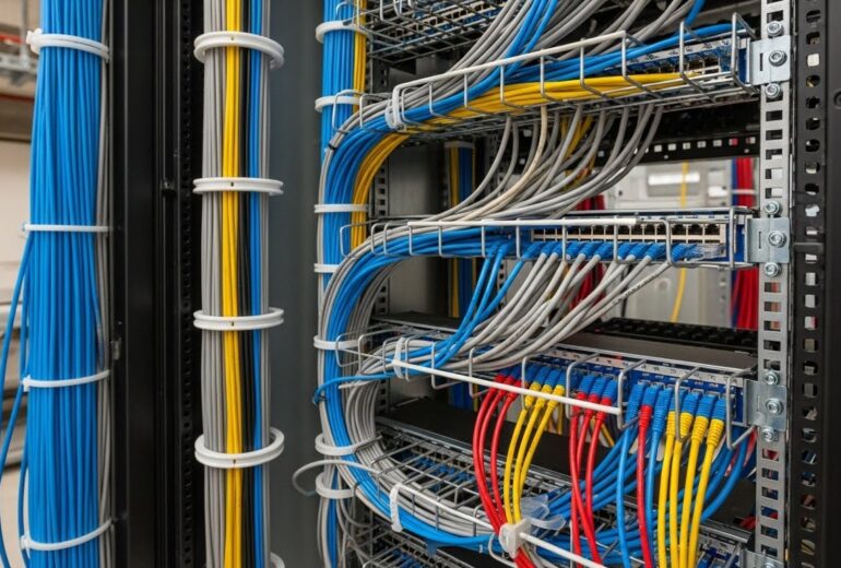 LANケーブル配線・端末建物の用途や運用状況を踏まえ、電気設備全体の構成を考えた施工を行っています。配線・分電盤・照明・動力設備など、電気設備に関わる工事を一括して対応し、長期的に安定した使用